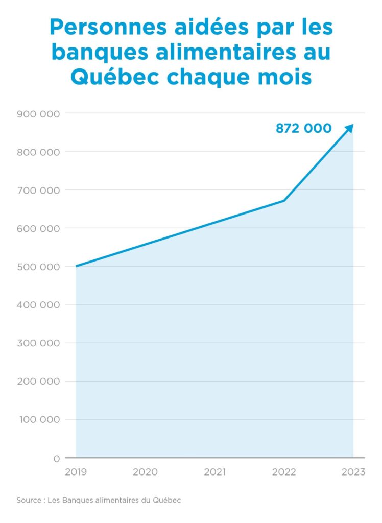 Au Québec, comme ailleurs en Occident, les causes de l’insécurité alimentaire sont rattachées à plusieurs déterminants : le revenu, en premier lieu, mais aussi l’aménagement du territoire, le prix des logements et plus particulièrement, l’environnement alimentaire. La situation est par ailleurs aujourd’hui exacerbée par la pandémie et l’augmentation récente du coût des aliments. En seulement un an, le nombre de personnes qui fréquentent les banques alimentaires québécoises a bondi de 30 % pour s’établir à 872 000 personnes par mois. Il s’agit d’un bond de 73 % par rapport au bilan prépandémique de 2019. Dans les régions plus éloignées, le coût de l’alimentation est décuplé par les frais de transport. Dans certains quartiers urbains, l’offre alimentaire est très réduite, et ce sont les dépanneurs qui remplacent souvent l’épicerie, en offrant des aliments peu variés dont le coût est très élevé.