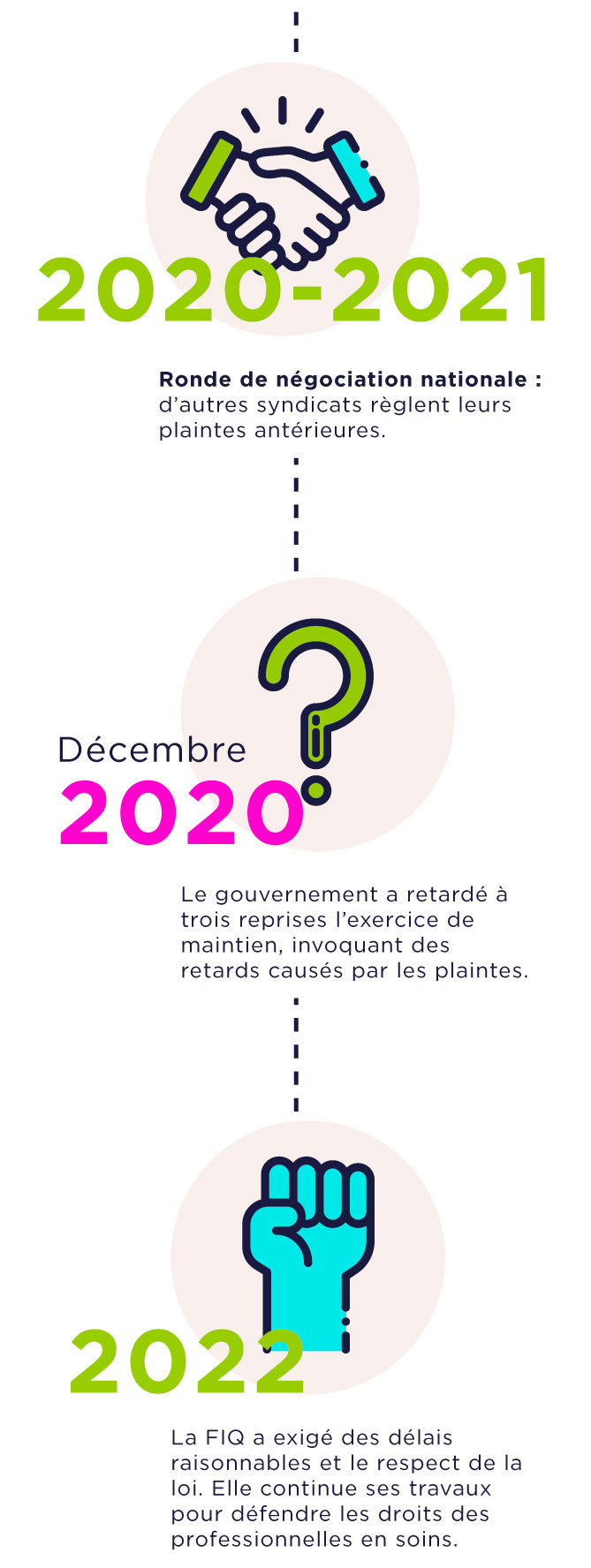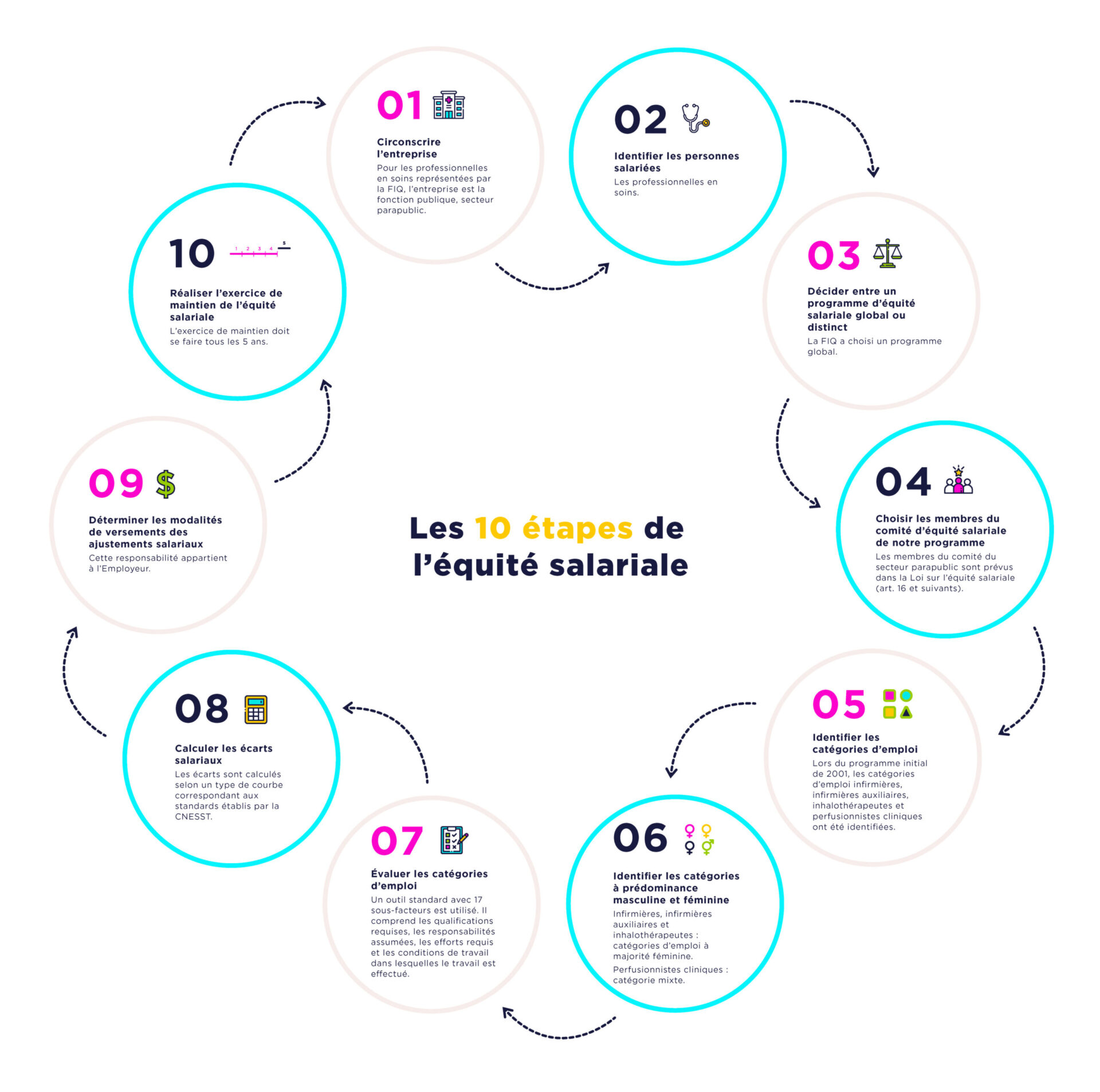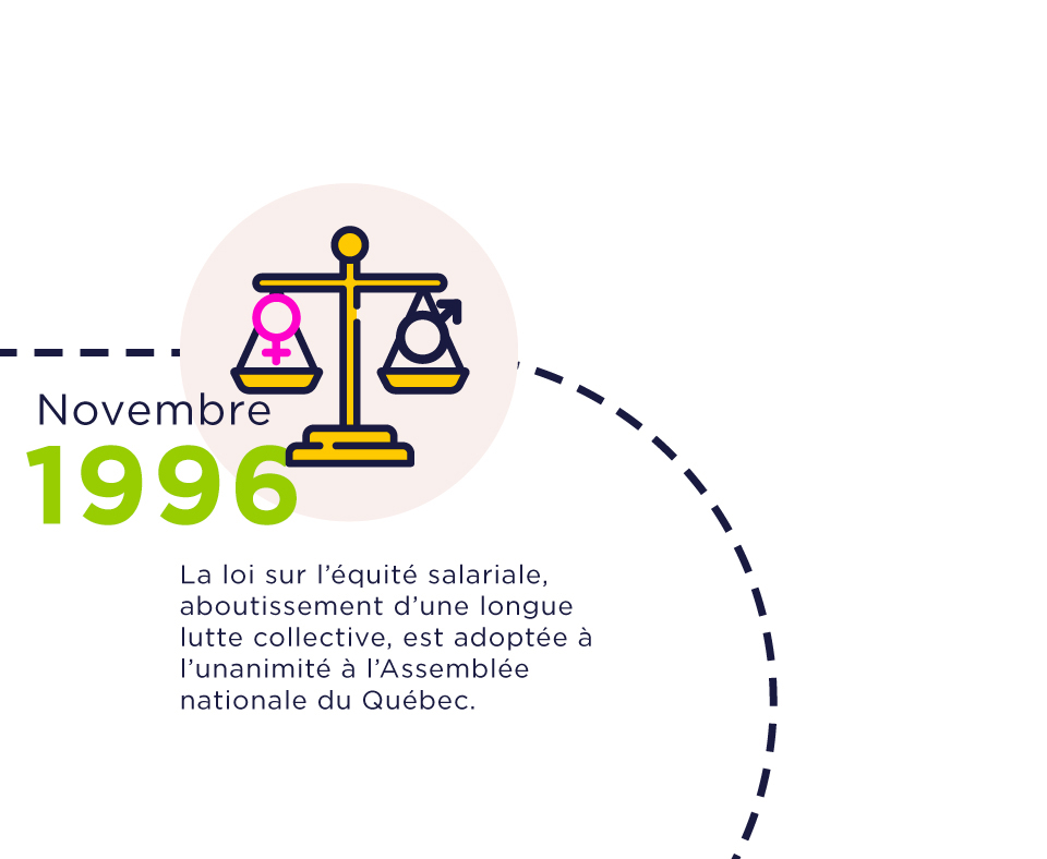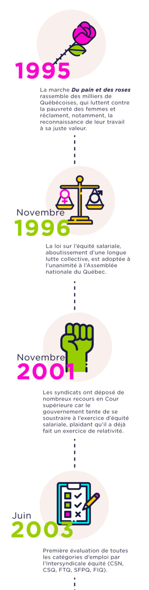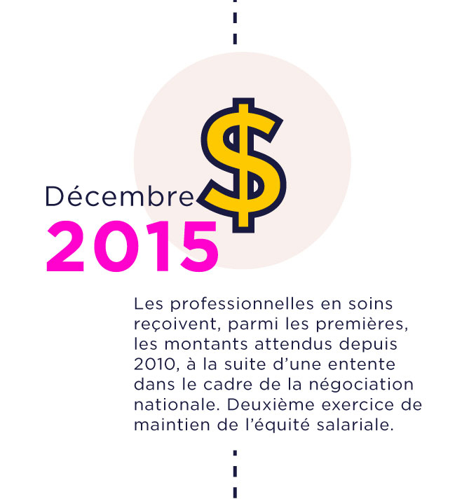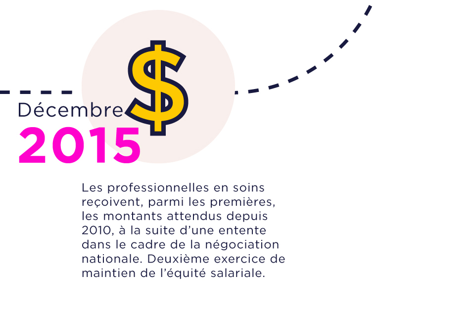 Depuis l’adoption de la Loi sur l’équité salariale, les élues de la FIQ, les militantes syndicales et les conseillères des différents secteurs et services de la Fédération ont mis leur expertise en commun pour assurer aux professionnelles en soins un salaire équitable, à la hauteur de leurs qualifications, de leurs responsabilités, de leurs efforts et de leurs conditions de travail.